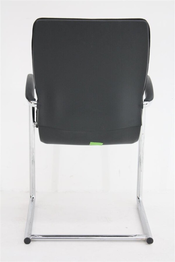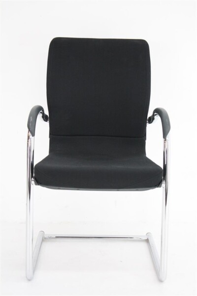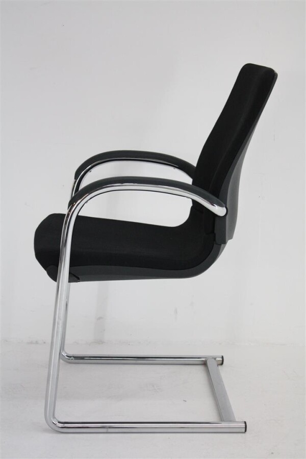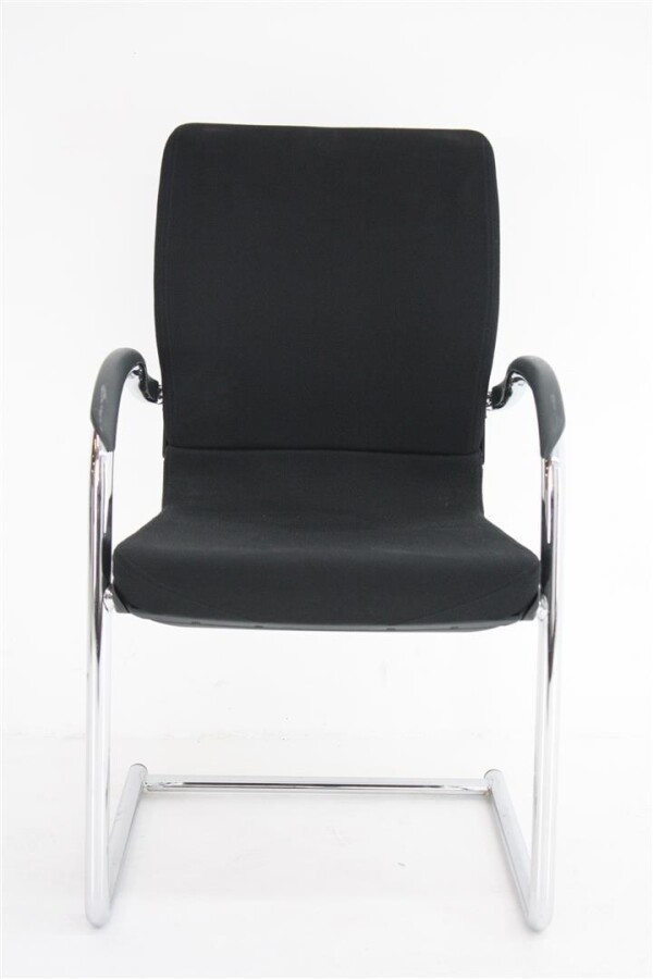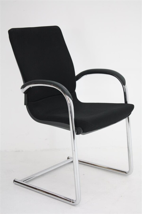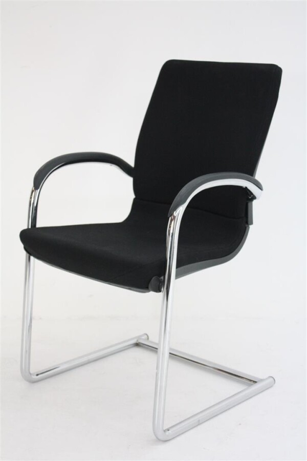 Wat direct opvalt aan deze uitvoering is de combinatie van de zwarte stoffen bekleding met het verchroomde sledeframe. Dat geeft de stoel een nette, professionele uitstraling die moeiteloos past in uiteenlopende interieurs. De zwart kunststof achterzijde van de rug en de kunststof opdek armleggers zorgen daarbij voor een robuuste afwerking die goed bestand is tegen intensief dagelijks gebruik.