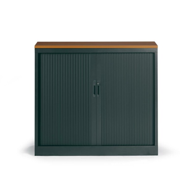 De THO Basic roldeurkast is de meest verkochte roldeurkast bij de THO. Deze degelijke kasten worden standaard geleverd met een zwart legbord en zijn voorzien van binnenuit verstelbare justeerdoppen (stelvoeten) om kleine oneffenheden in de ondergrond op te vangen. De roldeurkast heeft afsluitbare deuren van brandvertragend kunststof. De jaloeziedeuren zijn voorzien van sluitlamellen met magneetsluiting, wel zo handig. Het is mogelijk om laterale hangmappen (A4 formaat) onder het legbord te hangen.