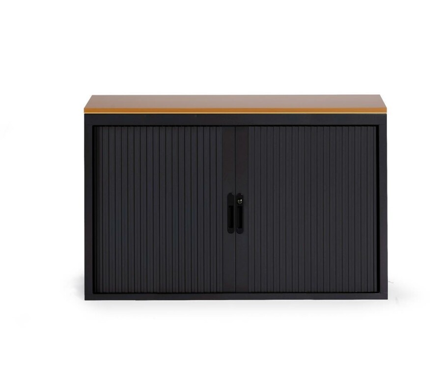 De THO Basic roldeurkast is de meest verkochte roldeurkast bij de THO. Deze degelijke kasten worden standaard geleverd met een zwart legbord en zijn voorzien van binnenuit verstelbare justeerdoppen (stelvoeten) om kleine oneffenheden in de ondergrond op te vangen. De roldeurkast heeft afsluitbare deuren van brandvertragend kunststof. De jaloeziedeuren zijn voorzien van sluitlamellen met magneetsluiting, wel zo handig. Het is mogelijk om laterale hangmappen (A4 formaat) onder het legbord te hangen. Vaak gevraagd: 'hoeveel ordners gaan er nu in deze kast?' Bij standaard ordners mag u uitgaan van 12 a 13 ordners per legbord/etage. Maakt voor deze kast zeker 24 ordners!