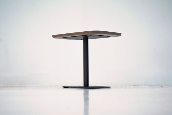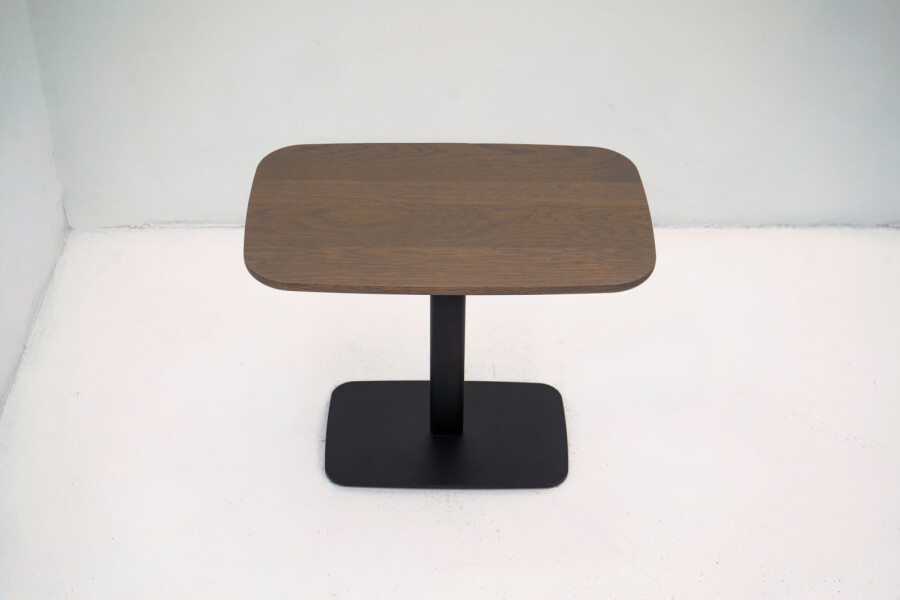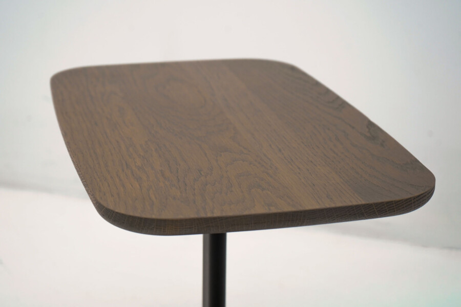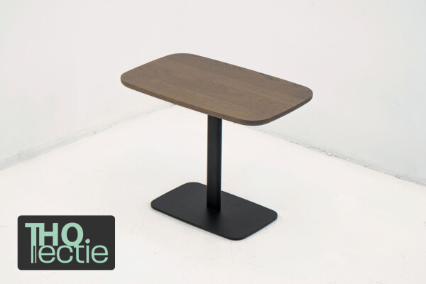 Het tafelblad van donker eiken (20 mm dik) geeft een warme en natuurlijke uitstraling, terwijl het zwarte kolompootonderstel stabiliteit en een moderne esthetiek biedt. Met afmetingen van 52x32 cm (bxd) en een hoogte van 40 cm is deze bijzettafel ideaal naast een stoel, bank, bureau of als extra werk- of presentatietafel in vergaderruimtes.