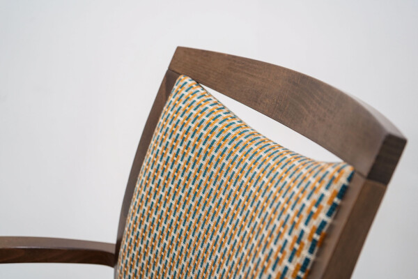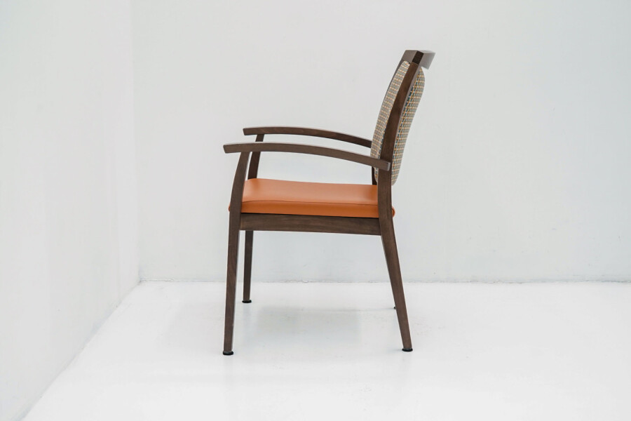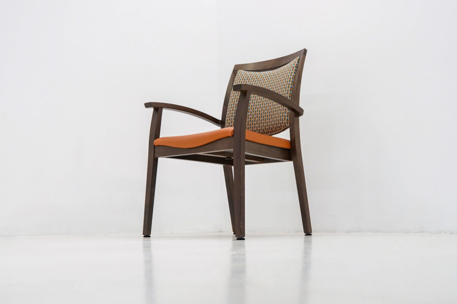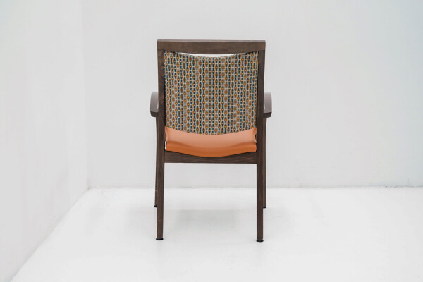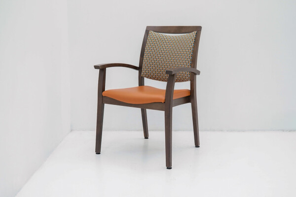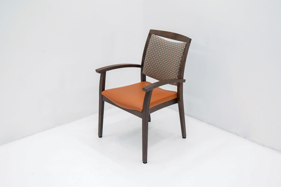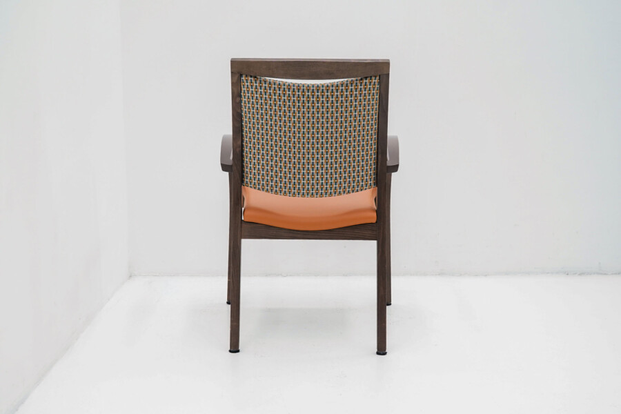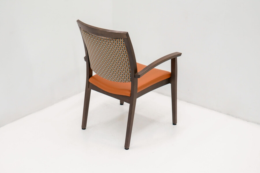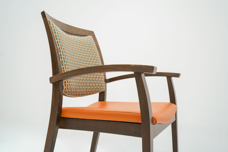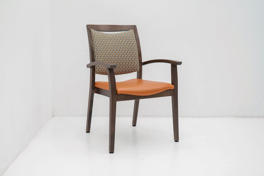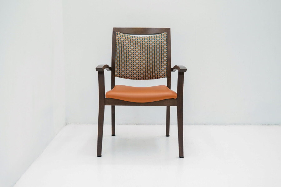 Wat direct opvalt is de combinatie van het bruine houten frame met de opvallende oranje bekleding. De stoffen rug zorgt voor comfort en ventilatie, terwijl de zitting in kunstleder praktisch en onderhoudsvriendelijk is. Ideaal voor kantines, vergaderruimtes of informele overlegplekken waar uitstraling én gebruiksgemak samenkomen.