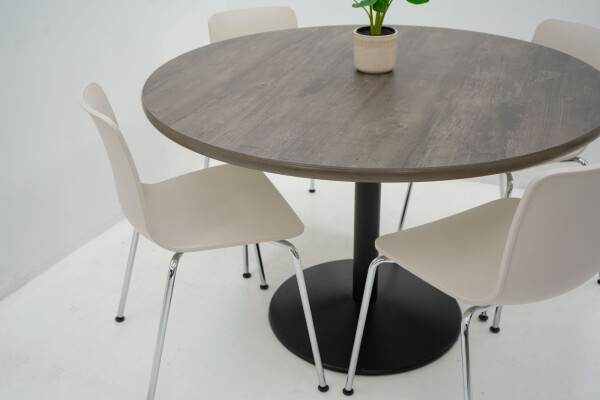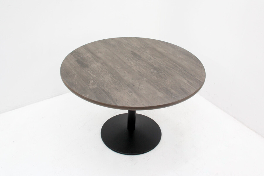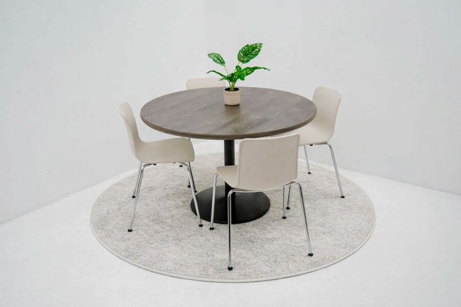 De set wordt compleet gemaakt met een ronde vergadertafel van Ø120 cm, uitgevoerd in logan eiken melamine. De ronde vorm nodigt uit tot gelijkwaardig overleg en zorgt voor een open, toegankelijke sfeer. Het stevige blad van 30 mm rust op een zwarte metalen trompetpoot: stabiel, strak en tijdloos. Precies wat je verwacht van professioneel kantoormeubilair.