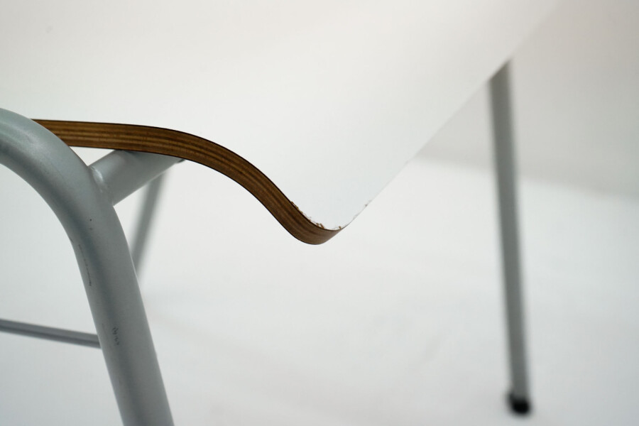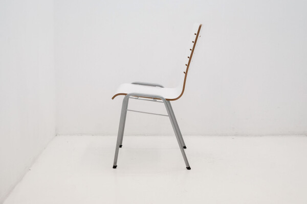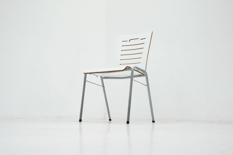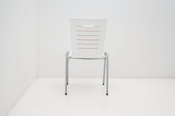 De zitting en rugleuning zijn vervaardigd uit wit gelakt hout, wat zorgt voor een frisse, lichte uitstraling. Het slanke aluminiumkleurige metalen onderstel geeft de stoel een moderne en industriële touch, terwijl de vierpootsconstructie zorgt voor stabiliteit en langdurig gebruiksgemak.