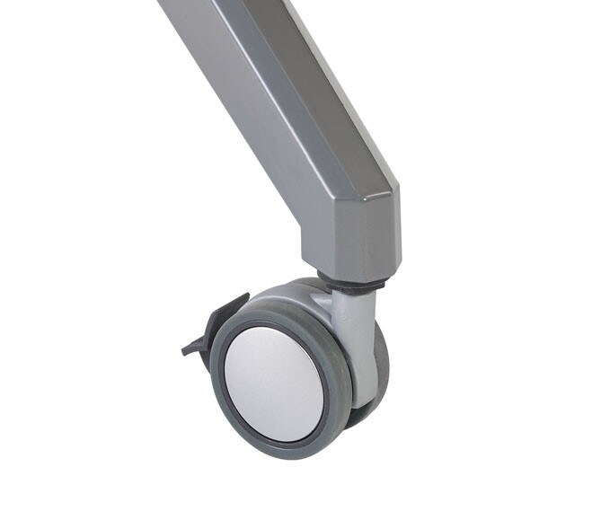 Deze frames zijn leverbaar in wit, zwart, alumium grijs of antraciet en altijd voorzien van vier geremde wielen. De metalen traverse (horizontale balk onder het werkblad) is altijd in zwart uitgevoerd.