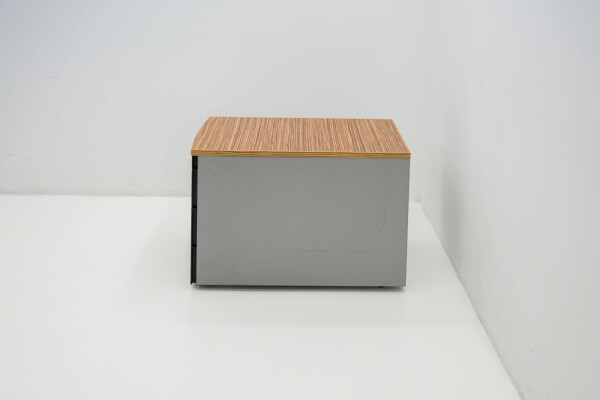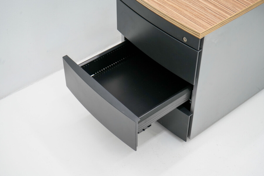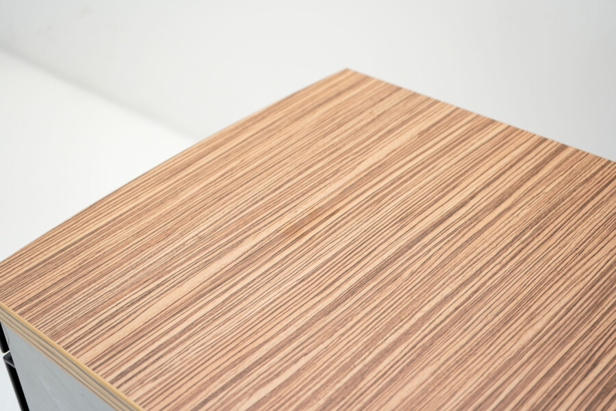 De metalen ombouw in grijs zorgt voor een solide basis en een industriële, tijdloze uitstraling. De zwarte metalen ladefronten geven het geheel een strak contrast en benadrukken het functionele karakter van dit ladeblok. Het topblad is uitgevoerd in Zebrano hout, een warme, karaktervolle houtsoort met een uitgesproken nerfstructuur. Dat maakt dit ladeblok niet alleen praktisch, maar ook visueel onderscheidend.