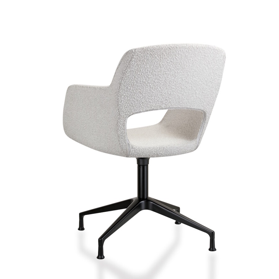 De THO Luma Spin is de draaibare variant binnen onze Luma-lijn: een moderne vergaderstoel met zachte Creme bouclé-teddy bekleding en een elegant, zwart gelakt metalen spinpoot onderstel. De royale kuip met geïntegreerde armleggers geeft direct comfort; de draaibare zitting zorgt voor soepele bewegingsvrijheid tijdens meetings en brainstorms.