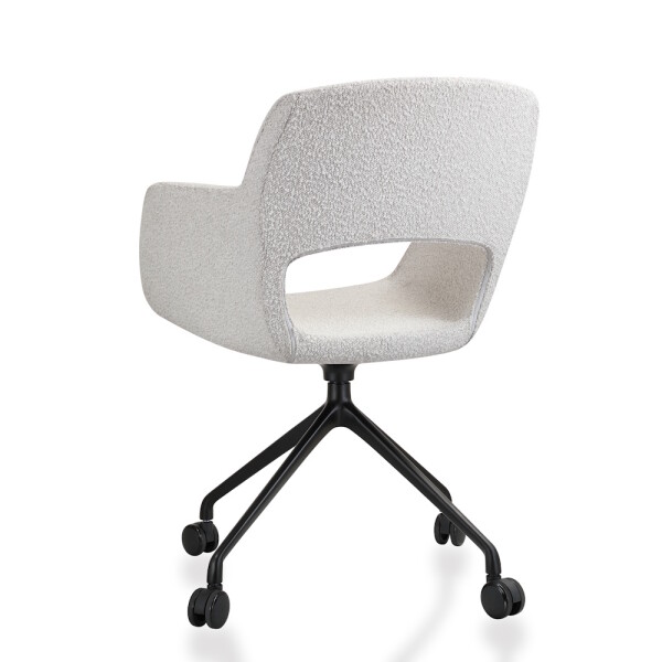 De THO Luma Verrijdbaar is de draaibare variant binnen onze Luma-lijn: een moderne vergaderstoel met zachte Creme bouclé-teddy bekleding en een elegant, zwart gelakt metalen spinpoot onderstel. De royale kuip met geïntegreerde armleggers geeft direct comfort; de draaibare zitting zorgt voor soepele bewegingsvrijheid tijdens meetings en brainstorms.