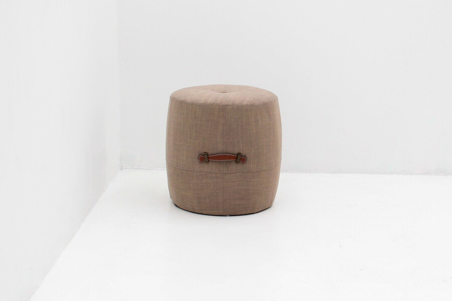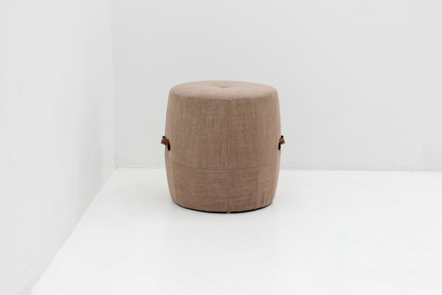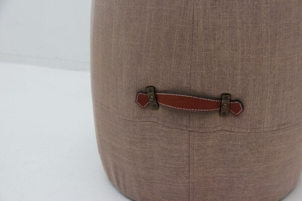 De poef is bekleed met een zachte grijs-bruine stof die rust en verfijning uitstraalt. De twee lederen handvatten aan de zijkant maken het eenvoudig om hem te verplaatsen, terwijl het ronde ontwerp en de solide vulling zorgen voor een prettig zitcomfort. Dankzij de hoogwaardige afwerking en het gebruik van duurzame materialen is deze poef niet alleen mooi, maar ook gemaakt om lang mee te gaan.