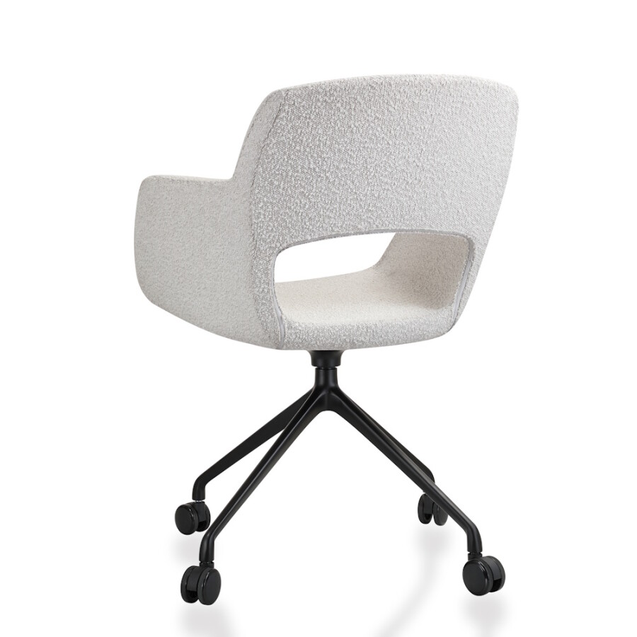 De THO Luma Verrijdbaar is de draaibare variant binnen onze Luma-lijn: een moderne vergaderstoel met zachte bouclé-teddy bekleding en een elegant, zwart gelakt metalen spinpoot onderstel. De royale kuip met geïntegreerde armleggers geeft direct comfort; de draaibare zitting zorgt voor soepele bewegingsvrijheid tijdens meetings en brainstorms.