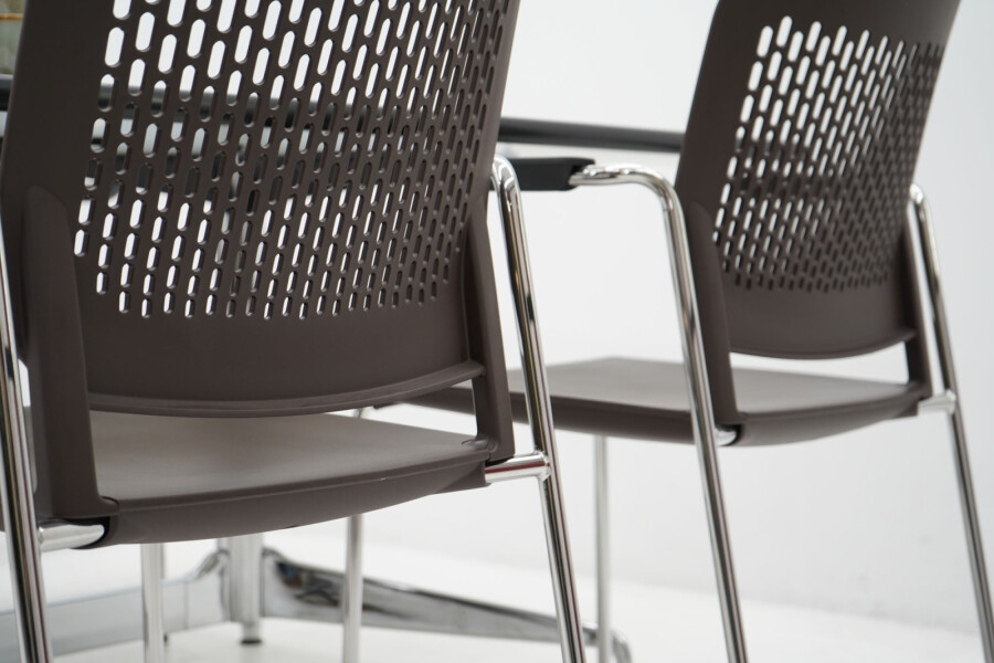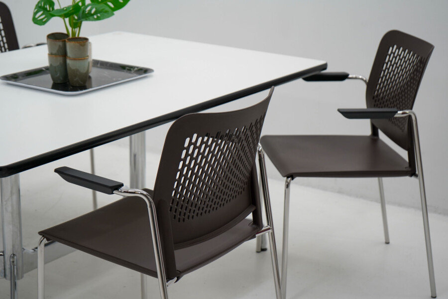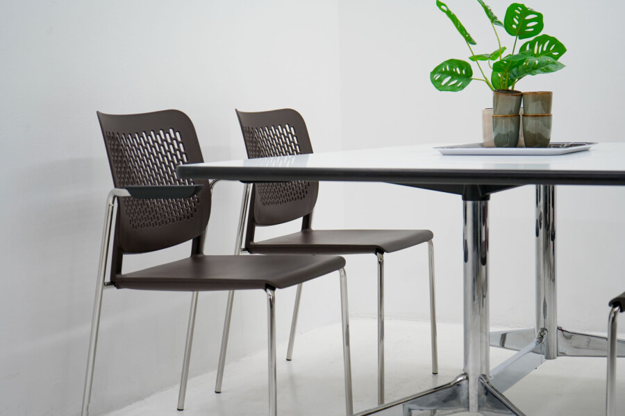 De A490 stoelen maken de set compleet. De kunststof (polypropyleen) kuip met armleggers biedt een comfortabele zit, terwijl het chromen frame zorgt voor stevigheid en een moderne uitstraling. Praktisch voordeel: ze zijn stapelbaar en licht in gewicht, ideaal voor dynamische werkomgevingen.