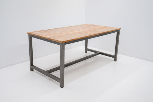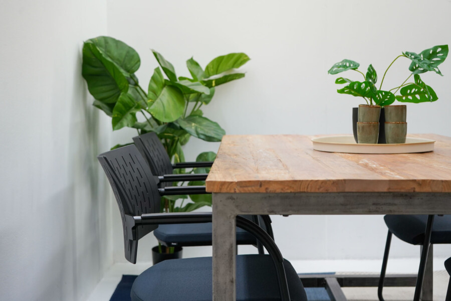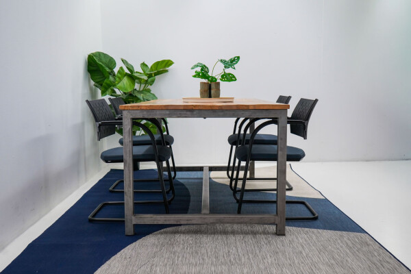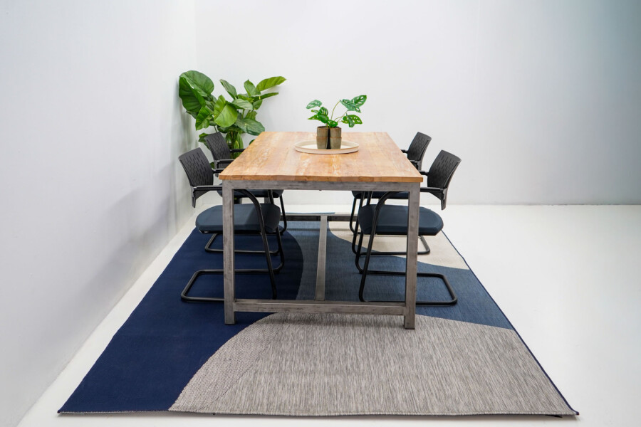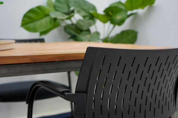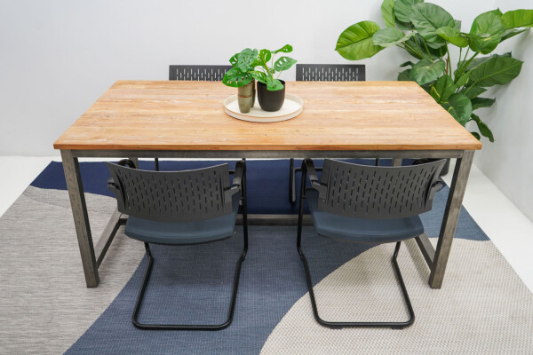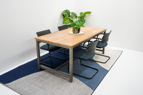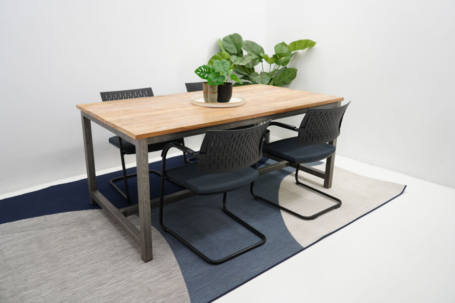 De vergadertafel vormt het solide middelpunt van de set. Het eiken werkblad geeft de ruimte een warme, natuurlijke uitstraling en voelt dankzij de bladdikte van 25 mm stevig en betrouwbaar aan. Het blank gelakte metalen 4-poots onderstel zorgt voor een strak, industrieel accent en optimale stabiliteit. Met een formaat van 180 × 98 cm is deze tafel zeer geschikt voor compacte tot middelgrote vergaderruimtes.