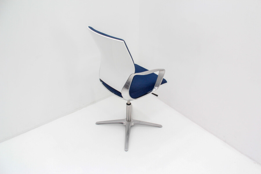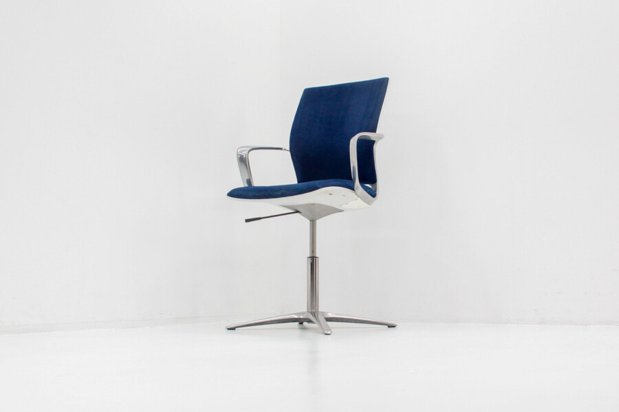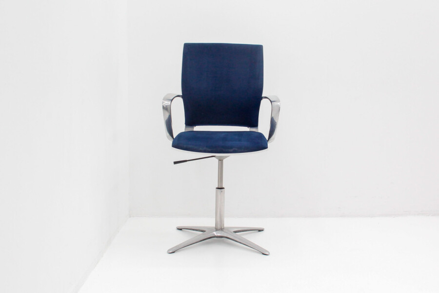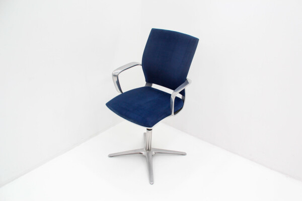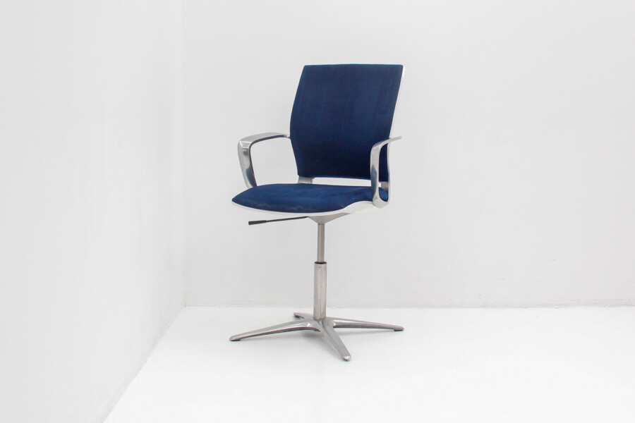 Klöber Moteo: ergonomische bureaustoel in blauw velours met chroom – circulair, stijlvol en professioneel.