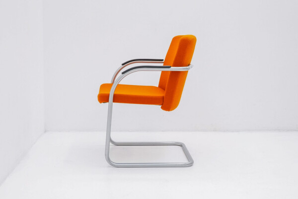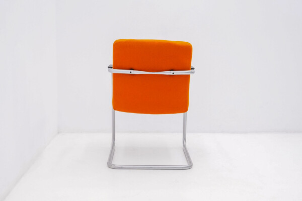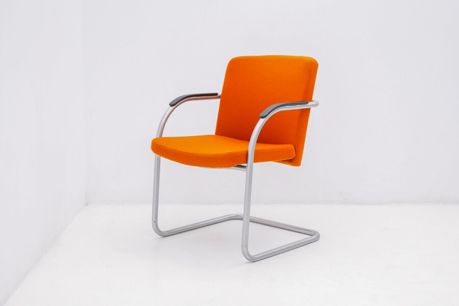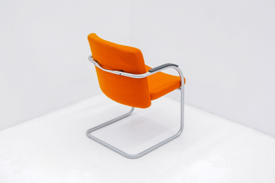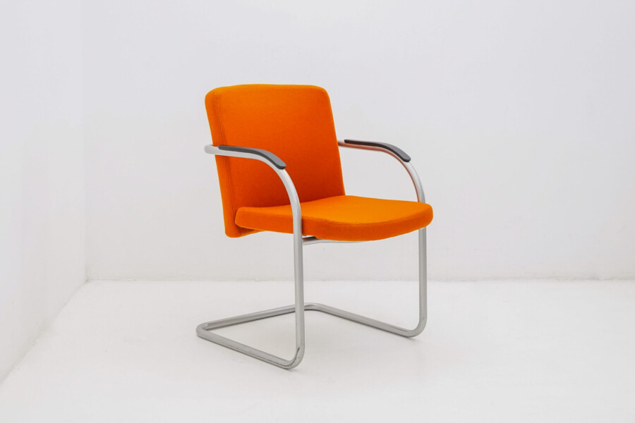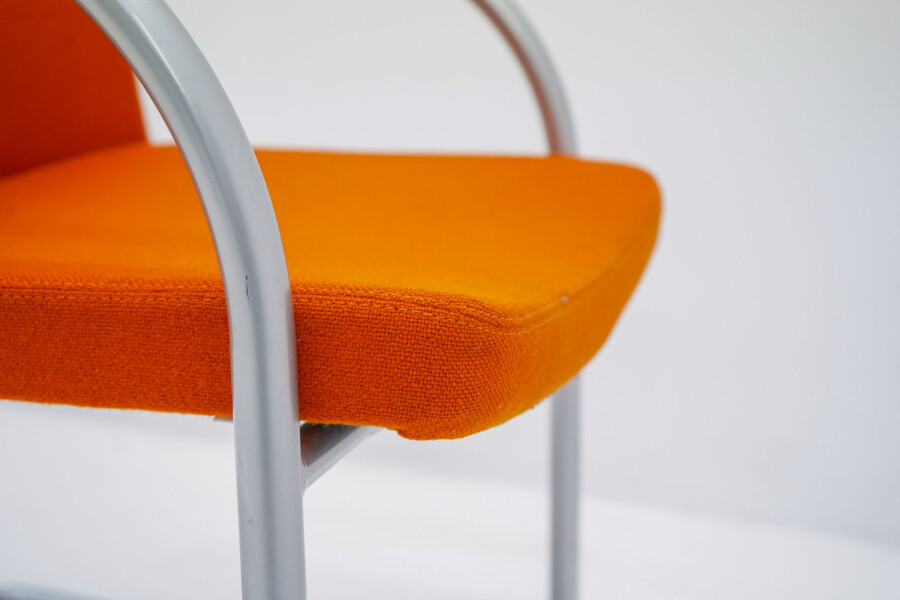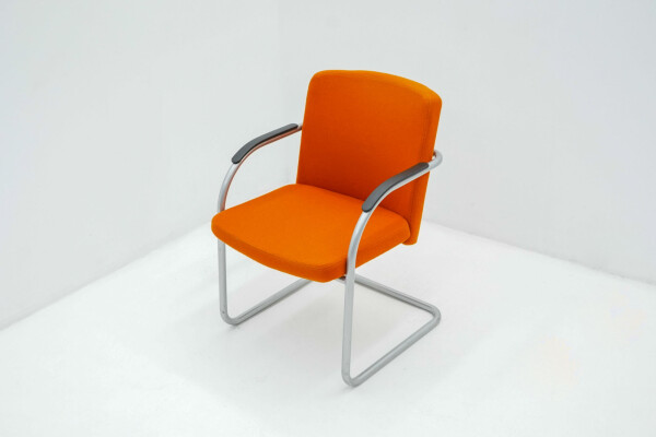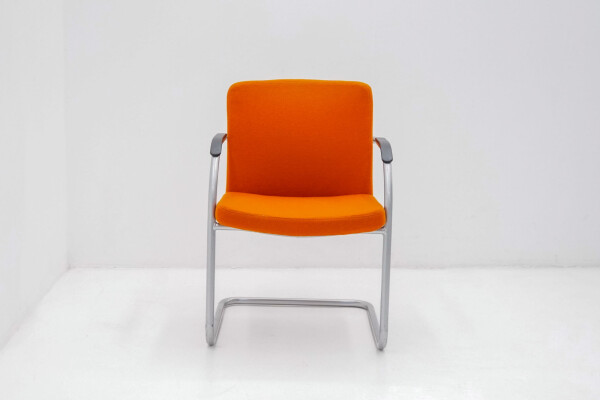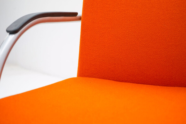De grof geweven oranje stoffering geeft deze stoel een warme, energieke uitstraling. Perfect voor vergaderruimtes, projectruimtes of ontvangstruimtes waar sfeer net zo belangrijk is als functionaliteit. Oranje werkt activerend, een subtiel psychologisch effect dat creativiteit en interactie stimuleert. Precies wat je wilt tijdens een brainstorm of overleg. Het sledeframe in aluminiumkleurig metaal zorgt voor stabiliteit en een strakke, professionele uitstraling. De zwarte kunststof armleggers bieden extra comfort en ondersteuning tijdens langere meetings. Dankzij de royale zitbreedte en comfortabele zitdiepte zit je ontspannen, zonder in te leveren op actieve werkhouding.