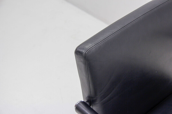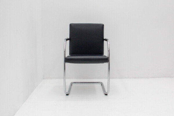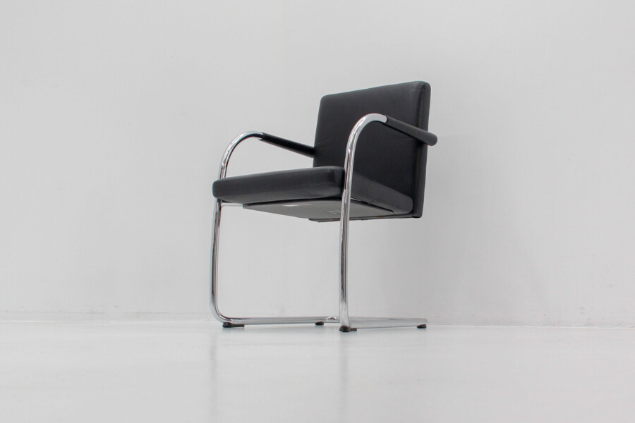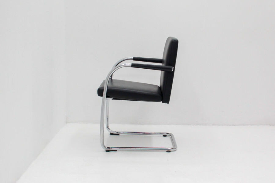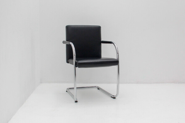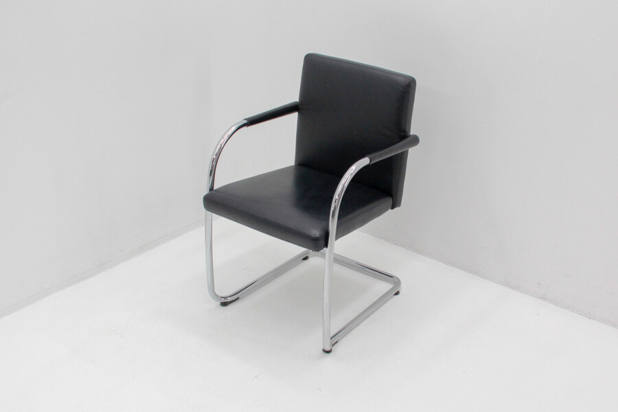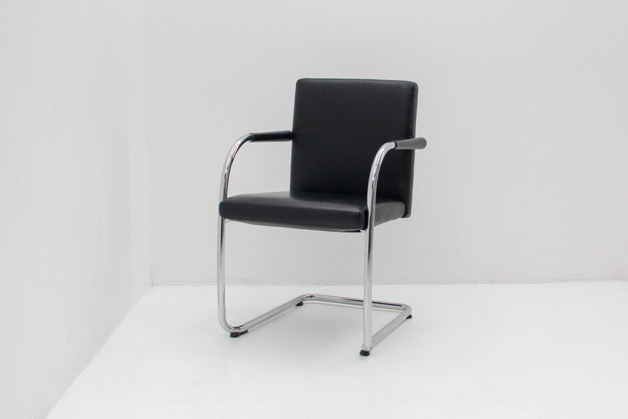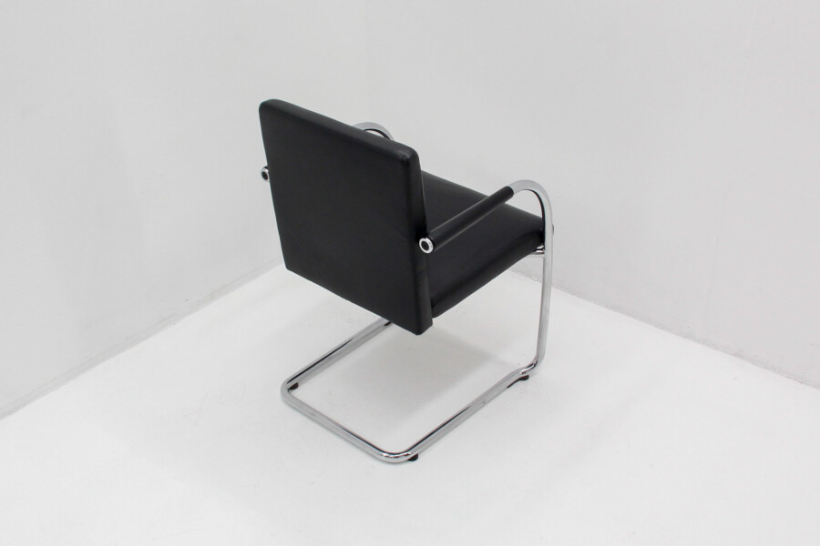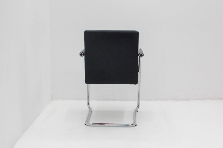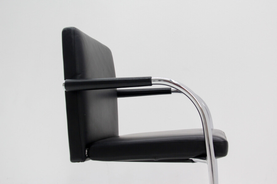 De zwarte lederen bekleding zorgt voor een luxueuze uitstraling en een prettig zitgevoel. In combinatie met het verchroomde sledeframe ontstaat een modern en verfijnd geheel dat moeiteloos past in elke vergader- of ontvangstruimte. De ergonomisch gevormde rug en zitting bieden uitstekende ondersteuning, zodat je ook tijdens langere meetings comfortabel blijft zitten.