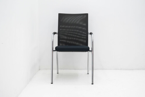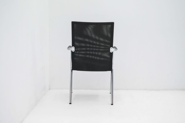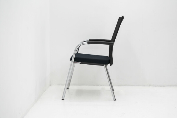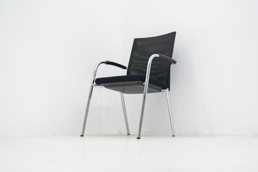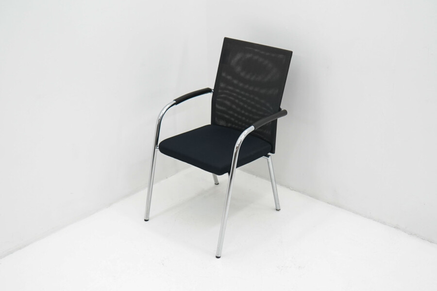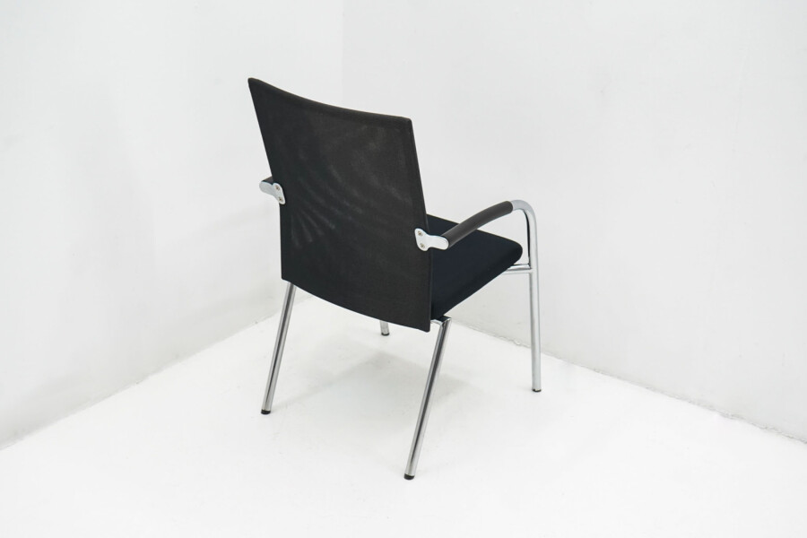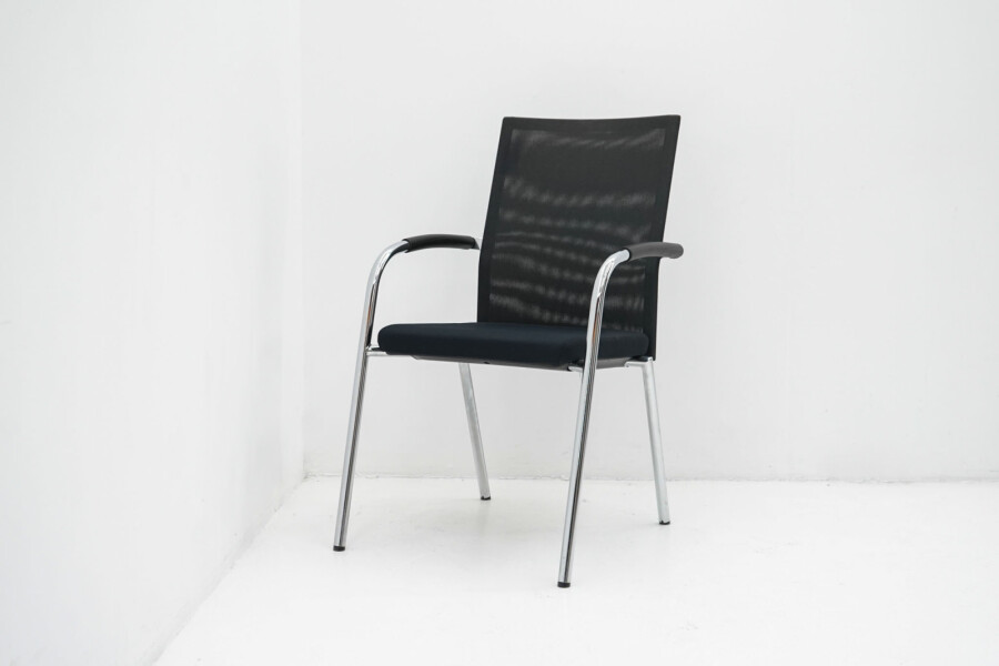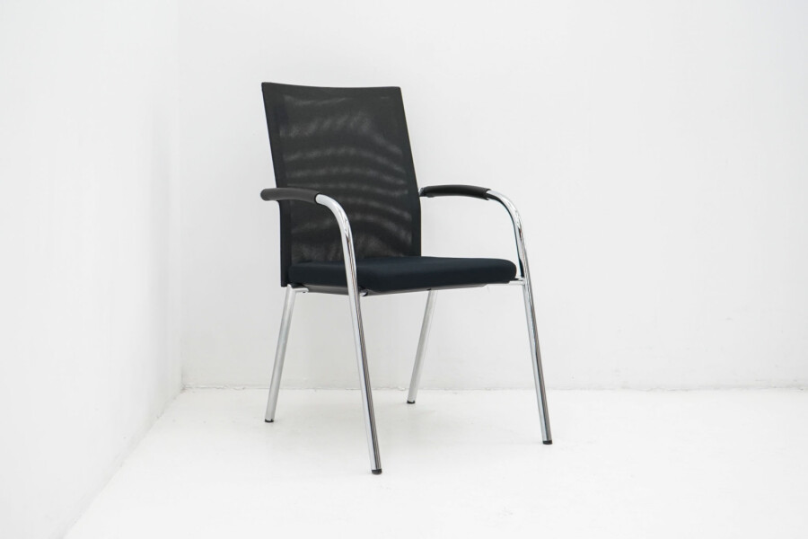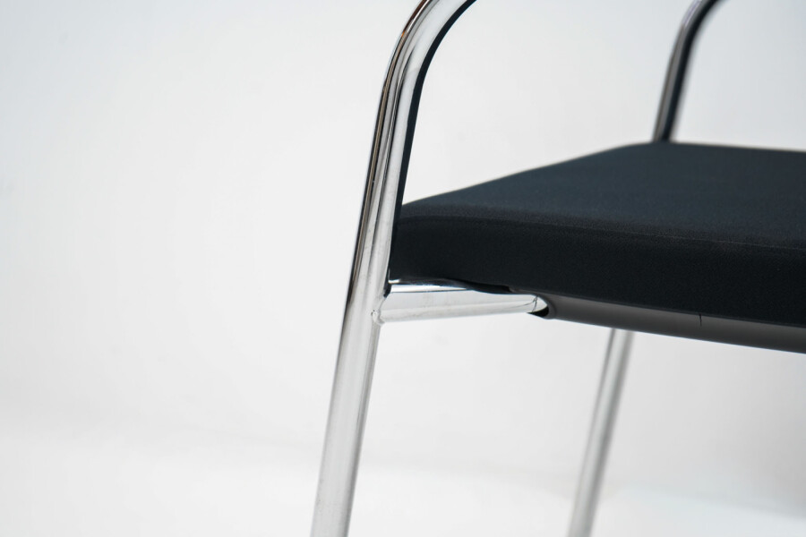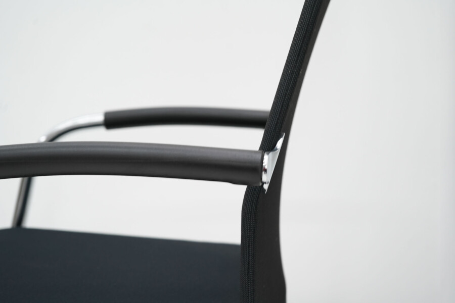 Het slanke 4-poots onderstel van verchroomd metaal geeft de stoel een moderne, professionele uitstraling en maakt hem eenvoudig te combineren met verschillende tafels en interieurs. De zwarte armleggers bieden extra ondersteuning bij langer zitten, zonder dat ze dominant aanwezig zijn in het ontwerp.