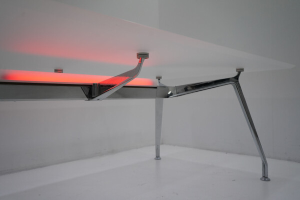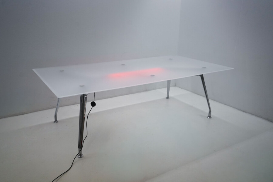 Wat deze Ahrend 1200 écht onderscheidt, is de rode lamp aan de onderzijde. Deze is duidelijk aanwezig en maakt van de tafel een visueel statement in de ruimte. Geen subtiel detail, maar een uitgesproken element dat de tafel laat opvallen in vergaderruimtes, creatieve omgevingen of designgerichte kantoren. Precies het soort slimme, eigenzinnige toevoeging waar Ahrend om bekendstaat.