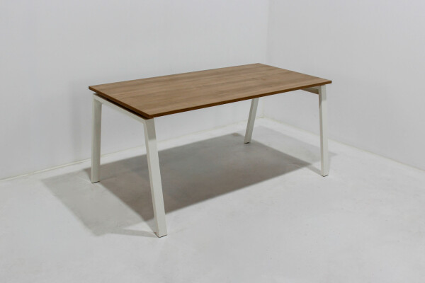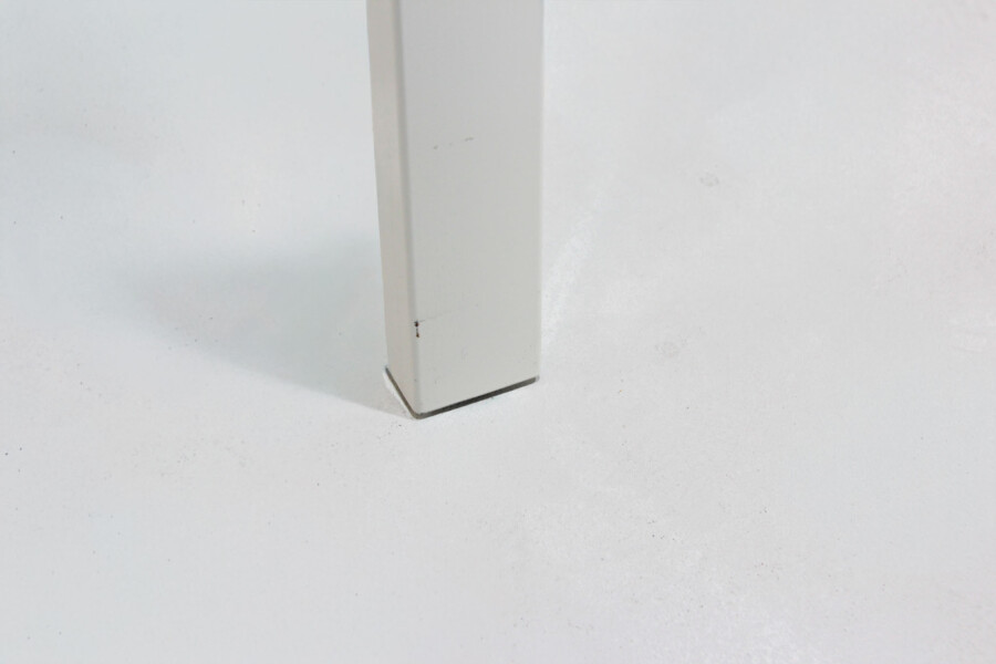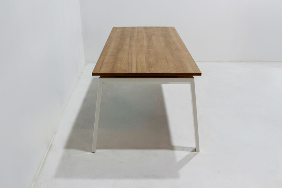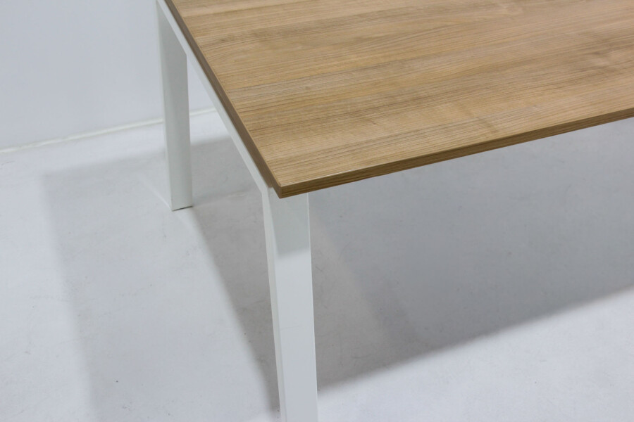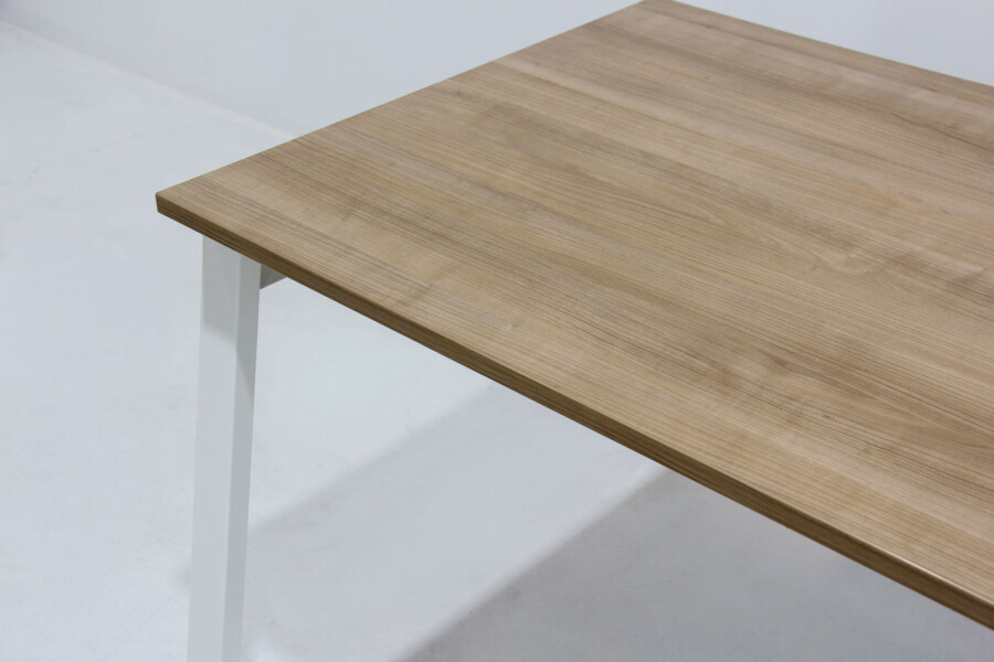 Het nieuwe melamine werkblad is 22 mm dik en slijtvast, waardoor het uitstekend bestand is tegen intensief gebruik, koffiekopjes, laptops en snelle notities tijdens overlegmomenten. De vaste hoogte van 76 cm en de stabiele V-pootconstructie zorgen voor een comfortabele houding en optimale beenruimte, ook voor langere sessies. De zwarte dwarsbalk onder het blad versterkt de stabiliteit én geeft de tafel een subtiel industrieel detail.