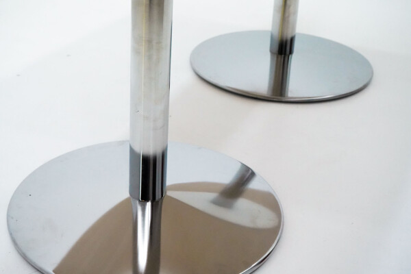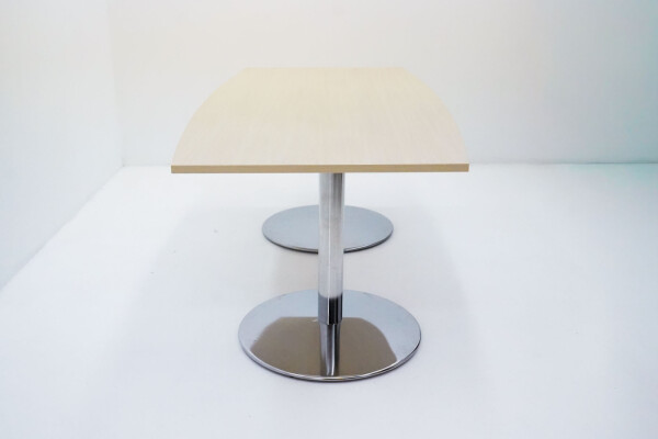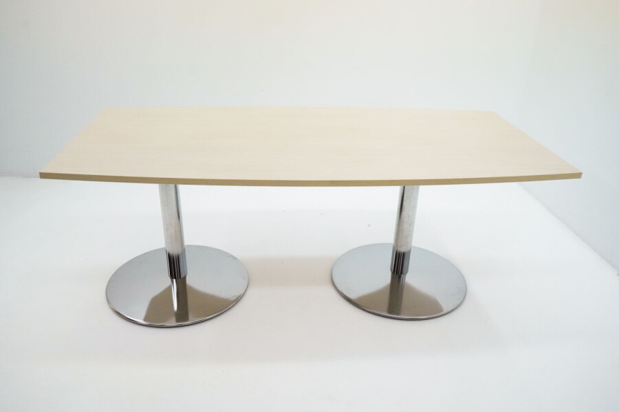 Het onderstel bestaat uit twee stevige kolompoten in chroomkleurig metaal. Dit geeft de tafel een moderne, professionele look en zorgt tegelijkertijd voor optimale stabiliteit. De vaste hoogte van 76 cm sluit perfect aan bij de standaard ergonomische werkhoogte voor vergadertafels.