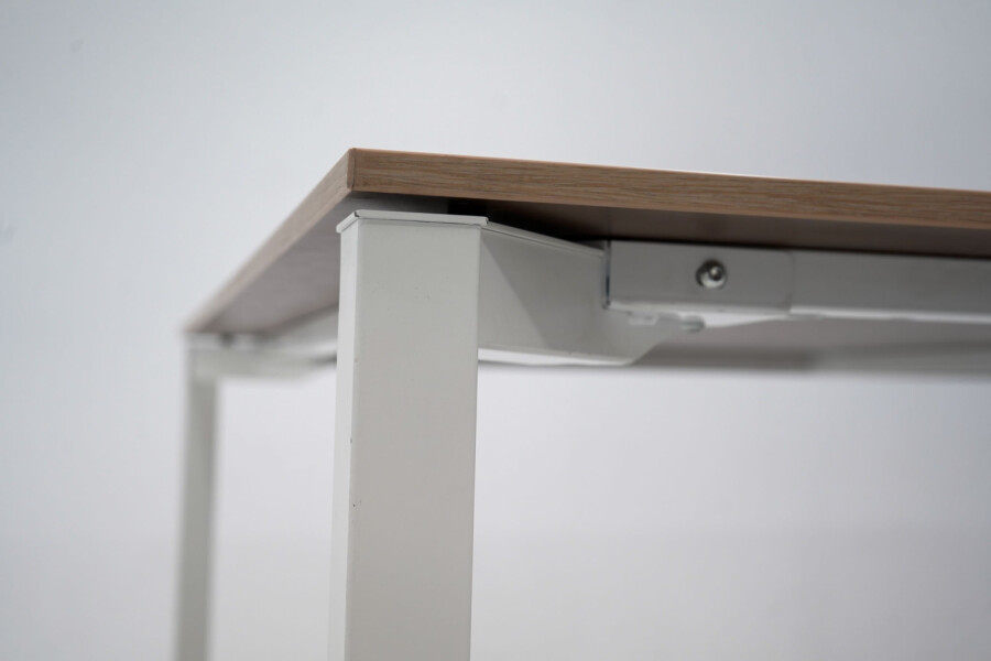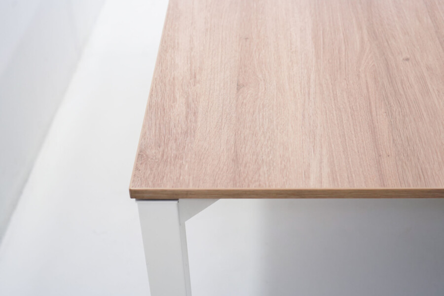 Het werkblad is uitgevoerd in melamine met een Robson eiken decor: warm, natuurlijk en professioneel. De bladdikte van 15 mm zorgt voor een slank silhouet, terwijl het stevige metalen 4-poot onderstel in wit garant staat voor stabiliteit en een strakke uitstraling. Dankzij de justeerdoppen staat de tafel altijd recht, zelfs op ongelijke vloeren.