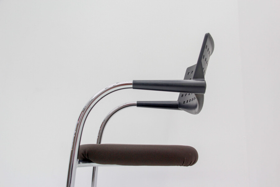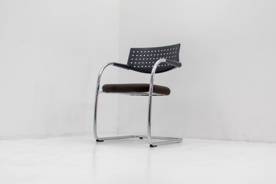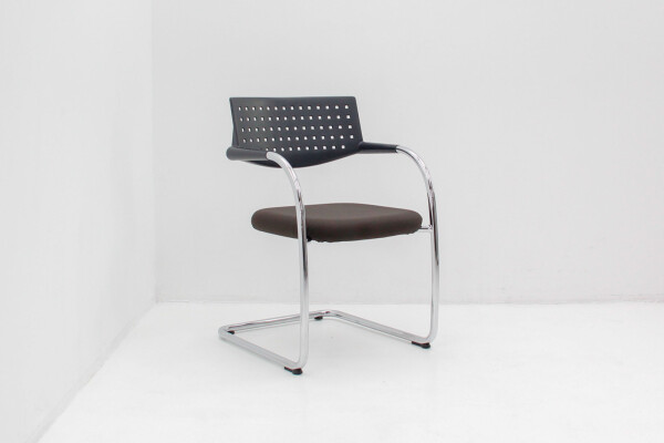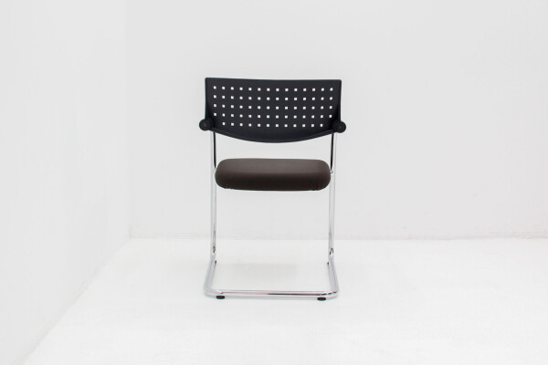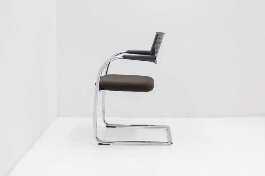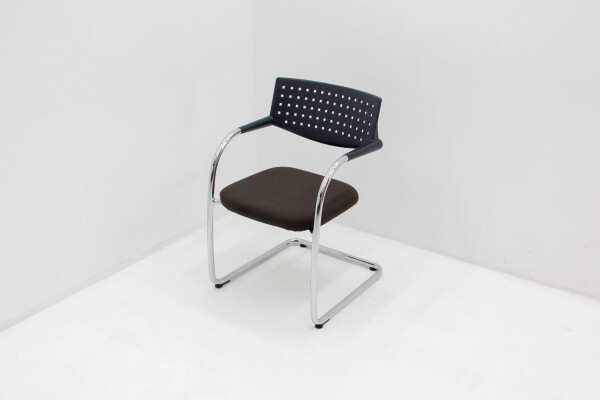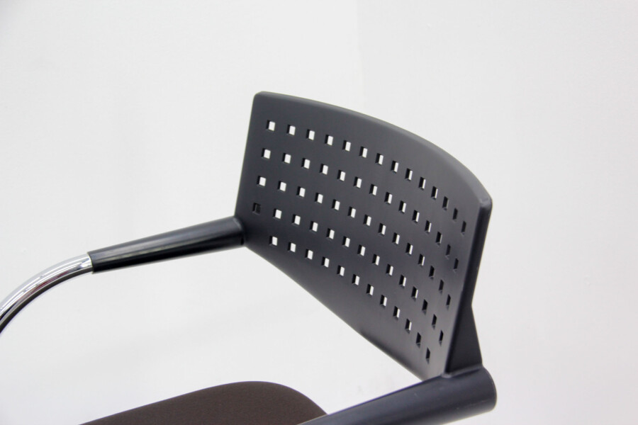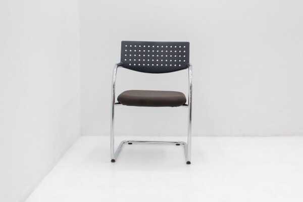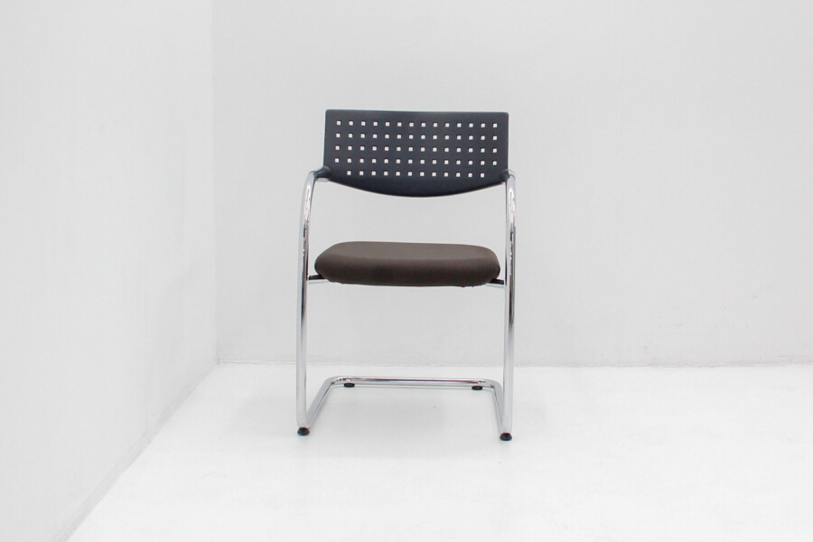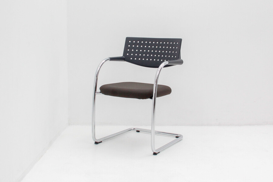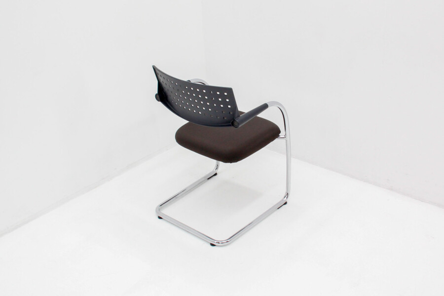 De Vitra Visavis is een iconische vergader- en bezoekersstoel, ontworpen door Antonio Citterio. De combinatie van een chromen sledeonderstel, zwarte kunststof rug en bruine stof op de zitting geeft een tijdloze, professionele uitstraling die in elke boardroom, meetingruimte of ontvangstruimte tot zijn recht komt. Het sledeframe zorgt voor subtiele vering en daarmee voor actief zitcomfort tijdens overlegmomenten.