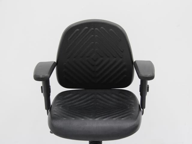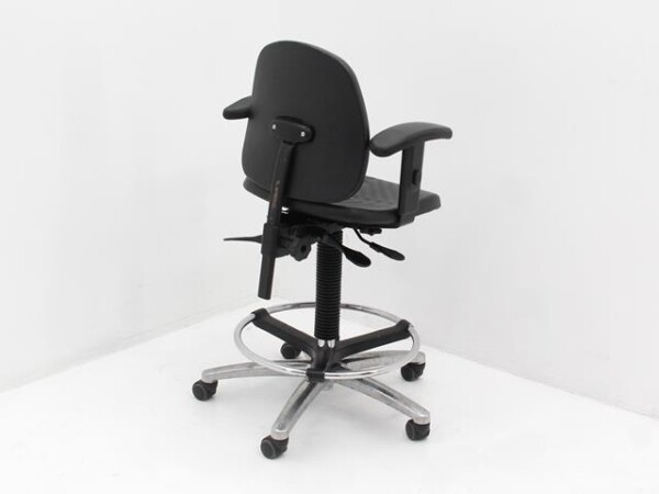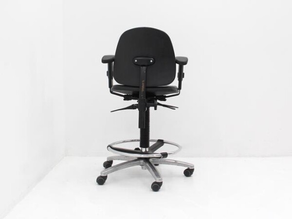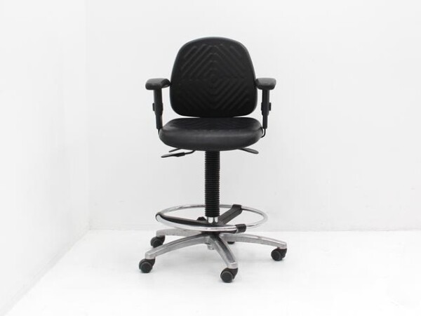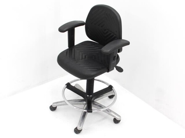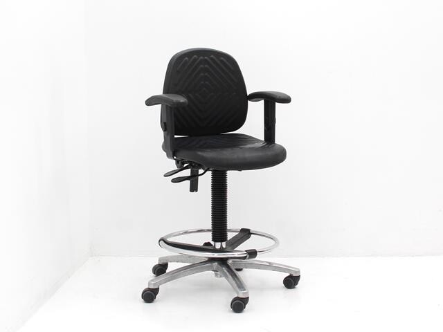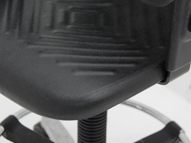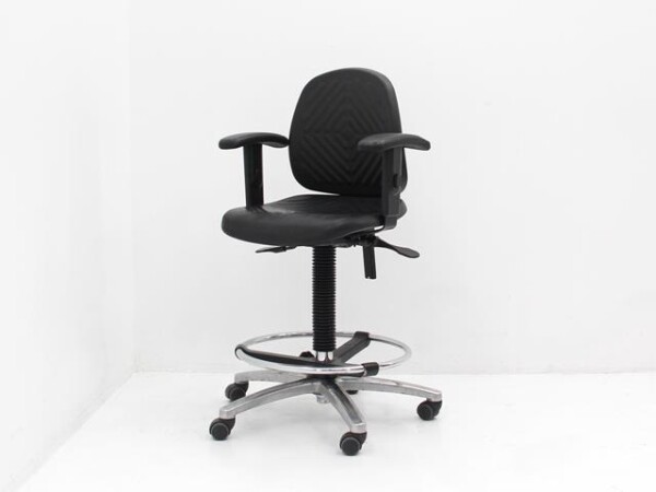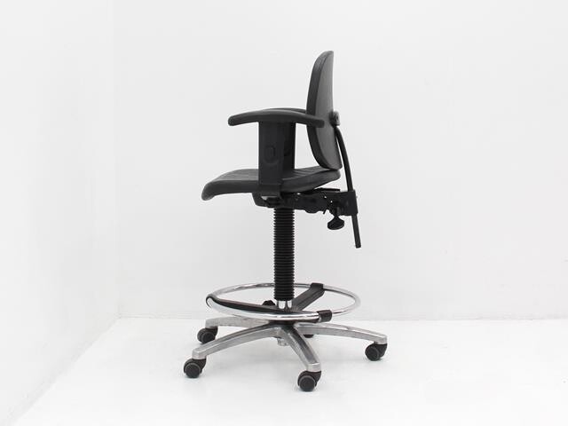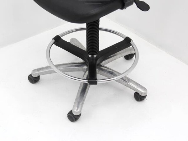 De zitting en rug zijn uitgevoerd in zwart PU schuim. Dat zorgt voor een stevige, onderhoudsvriendelijke afwerking die tegen een stootje kan en prettig is in dagelijks gebruik. Het chromen 5-poots onderstel met voetring geeft de stoel niet alleen een degelijke uitstraling, maar biedt ook extra ondersteuning bij hogere zitposities. Vooral op werkplekken waar afwisseling in zithouding belangrijk is, is dat een groot voordeel.